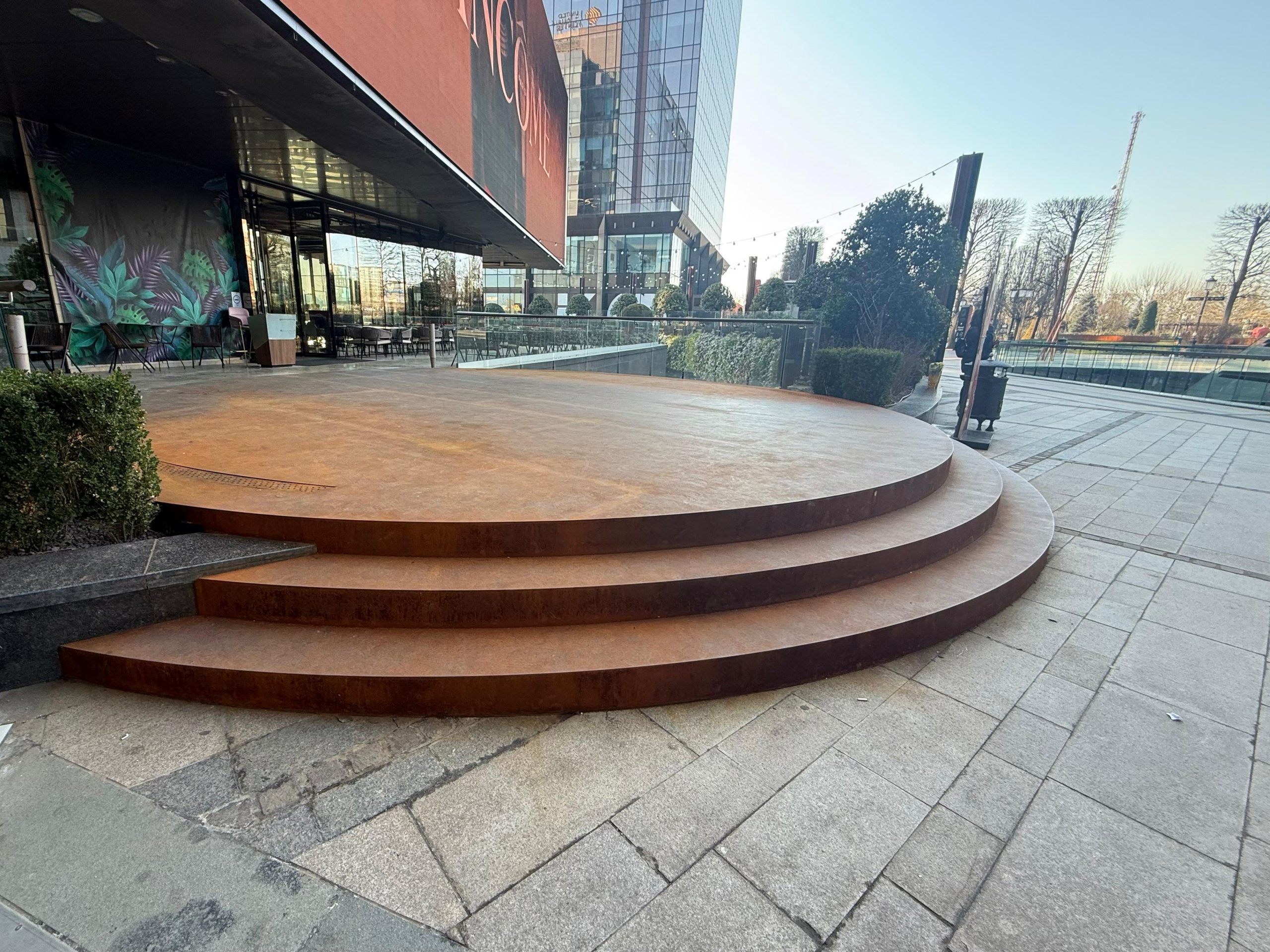 Operă de artă din CortenSteel realizată în Iulius Town Timișoara. Scară circulară monumentală cu pod integrat și balustradă din sticlă securizată cu mâna curentă din cupru.